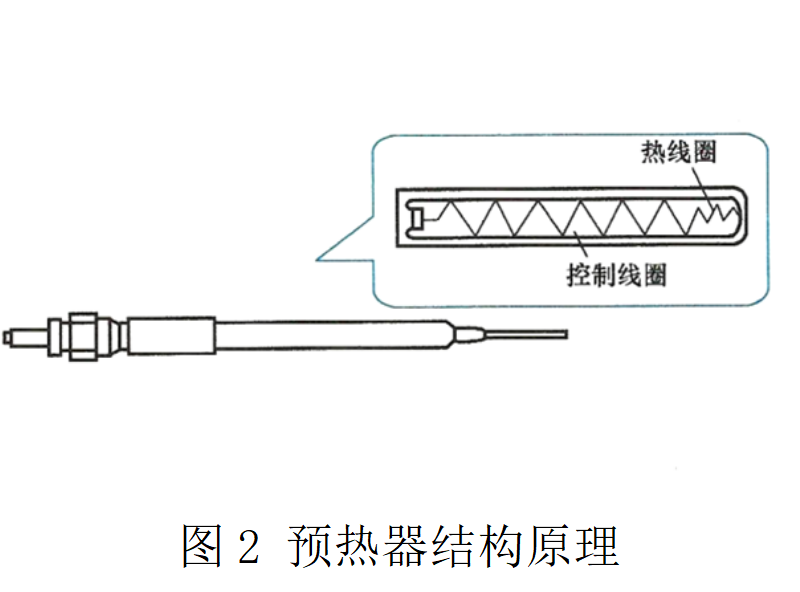 用于加熱燃燒室的空氣,如圖1所示;預熱器又稱為預熱塞,其結構原理如圖2所示。預熱器內裝有控制線圈,當其電阻隨著溫度的升高而增加時,可以減少流往與控制線圈串聯的熱線圈的電流量,使預熱器的溫度不會上升過高。預熱器的溫度可升至約900℃。